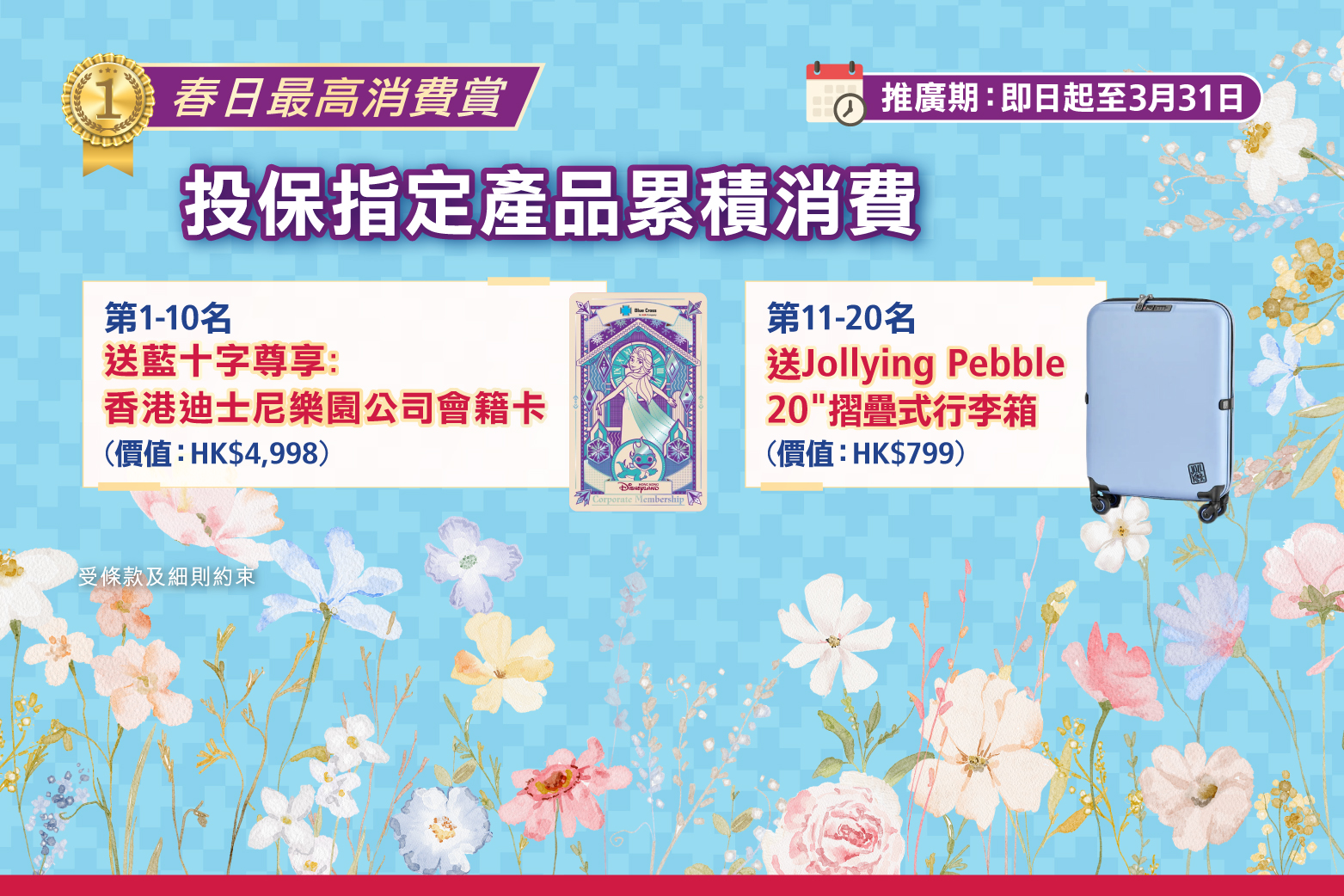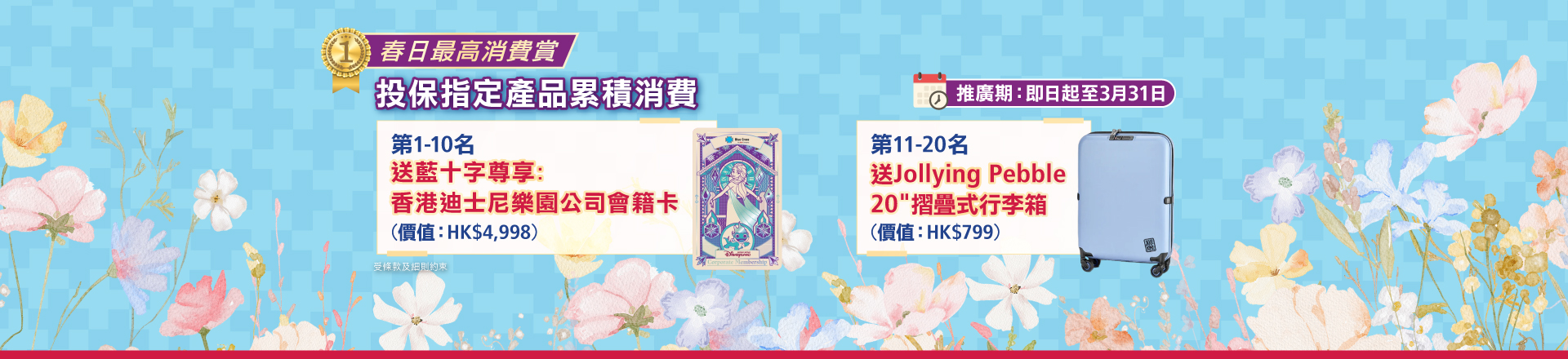 於推廣期內,投保藍十字指定保險產品累積消費最高的首10名會員, 將獲贈藍十字尊享:香港迪士樂園公司會籍卡一張(價值:HK$4,998) ! 第11名至第20名會員亦可獲一個Jollying Pebble 20"摺疊式⾏李箱 (價值:HK$ 799) !