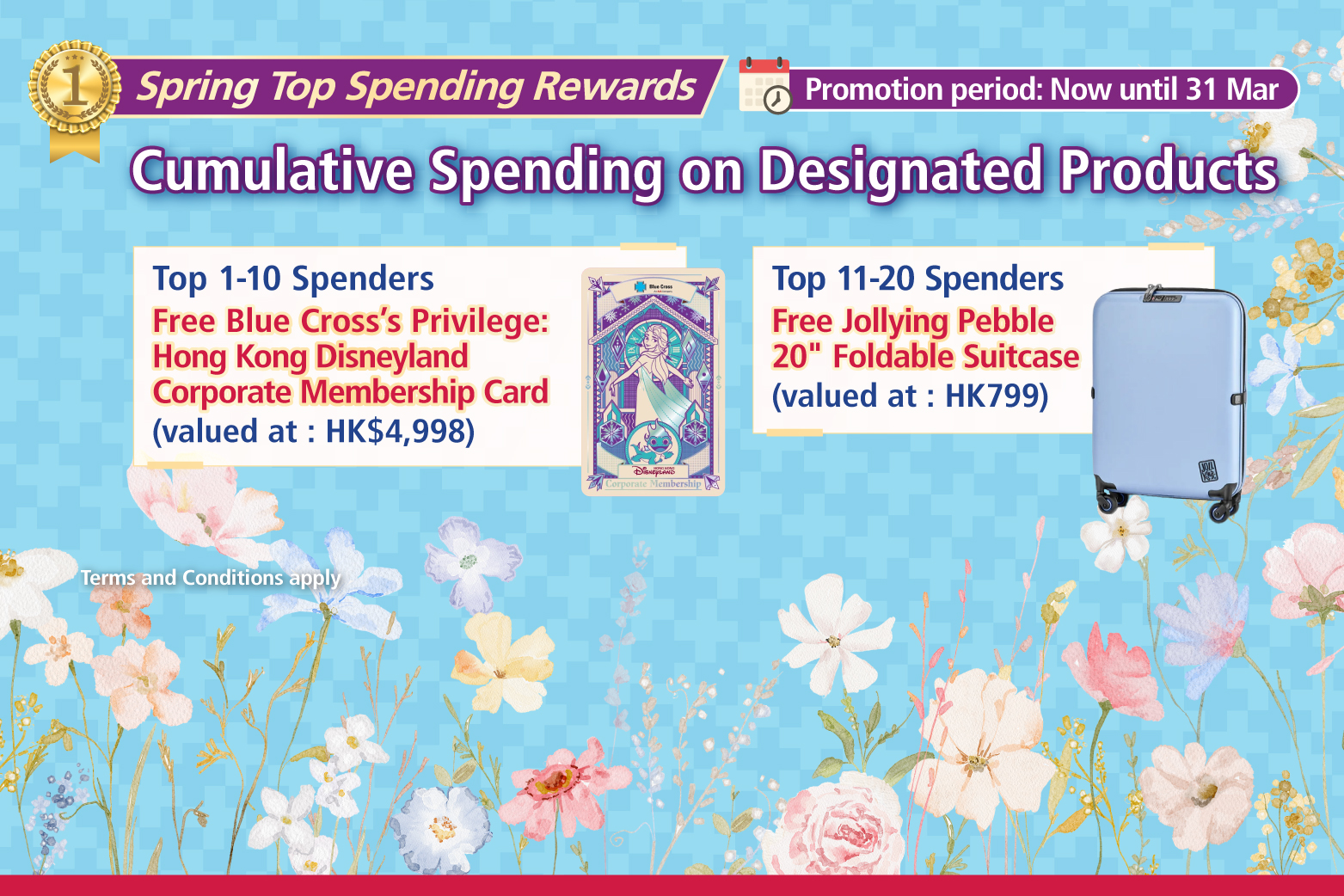 The top 10 members with the highest aggregate spending on the designated Blue Cross insurance products during the promotion period will receive one Blue Cross’s Privilege: Hong Kong Disneyland Corporate Membership Card (valued at HK$4,998)! Members ranked 11th to 20th will receive one Jollying Pebble 20" foldable suitcase (valued at HK$799)!
