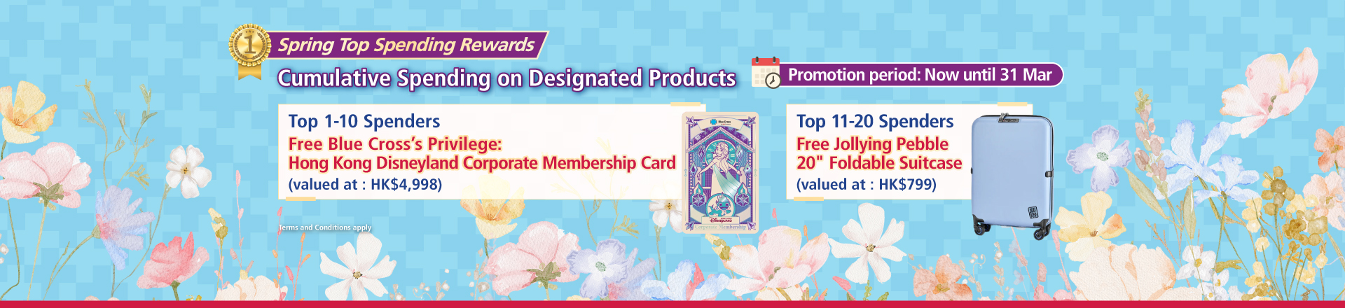 The top 10 members with the highest aggregate spending on the designated Blue Cross insurance products during the promotion period will receive one Blue Cross’s Privilege: Hong Kong Disneyland Corporate Membership Card (valued at HK$4,998)! Members ranked 11th to 20th will receive one Jollying Pebble 20" foldable suitcase (valued at HK$799)!